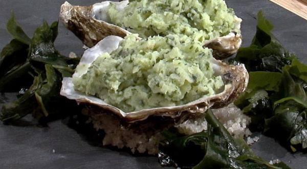 Dans le bol d'un blender, verser le beurre fondu, les huîtres avec leur eau, les algues, les épinards, la ricotta et le wasabi. Mixer rapidement et réserver.