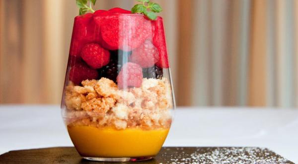 Panna cotta à la mangue, crumble coco et espuma de fruits rouges