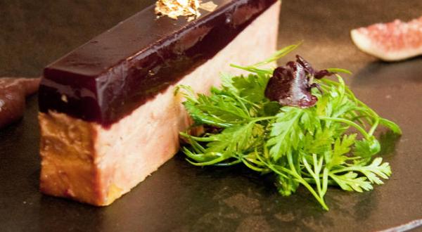 Foie gras façon opéra, gelée de porto et chutney de figues