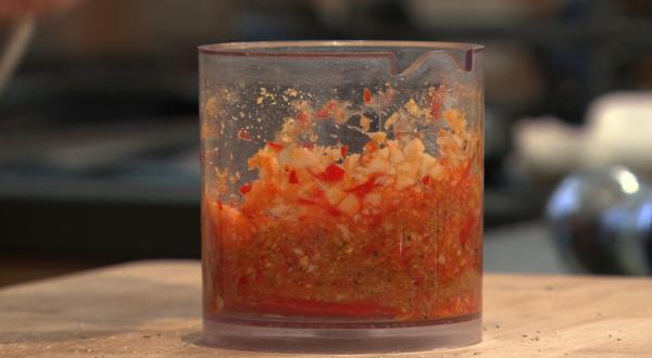 Mettre les piments et les gousses d'ail dans le bol d'un mixeur, mixer grossièrement.