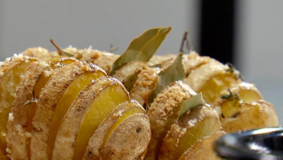 Disposer les hasselbackpotatis dans une assiette sans les casser. Verser un filet d’huile d’olive sur les pommes de terre chaudes.