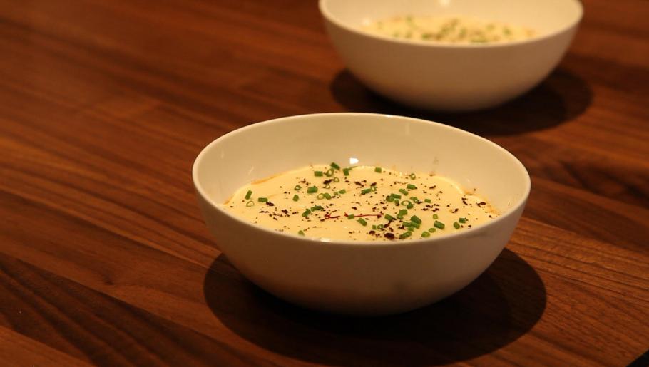 Secouer le siphon et dresser l'écume de pomme de terre sur la soupe.